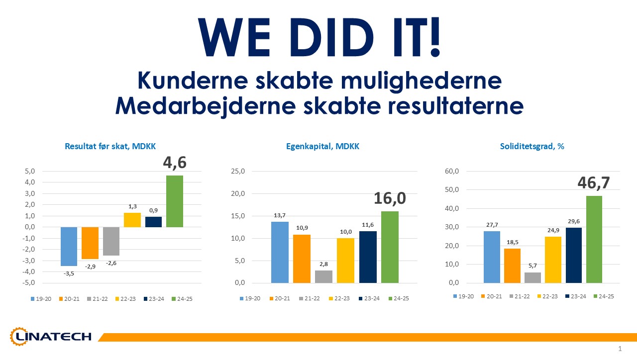 I regnskaberne for 2022-23 og 2023-24 så vi de første konturer af noget positivt, selv på trods af store udsving i omsætningen. Der var tegn på, at vi var på rette vej. Nu har vi så med regnskabet for 2024-25 bevist, at der er et fantastisk potentiale i Linatech. Omsætningen var flot, effektiviteten var høj, og medarbejderne gik den ekstra mil, for at vi kunne lykkes med tingene.